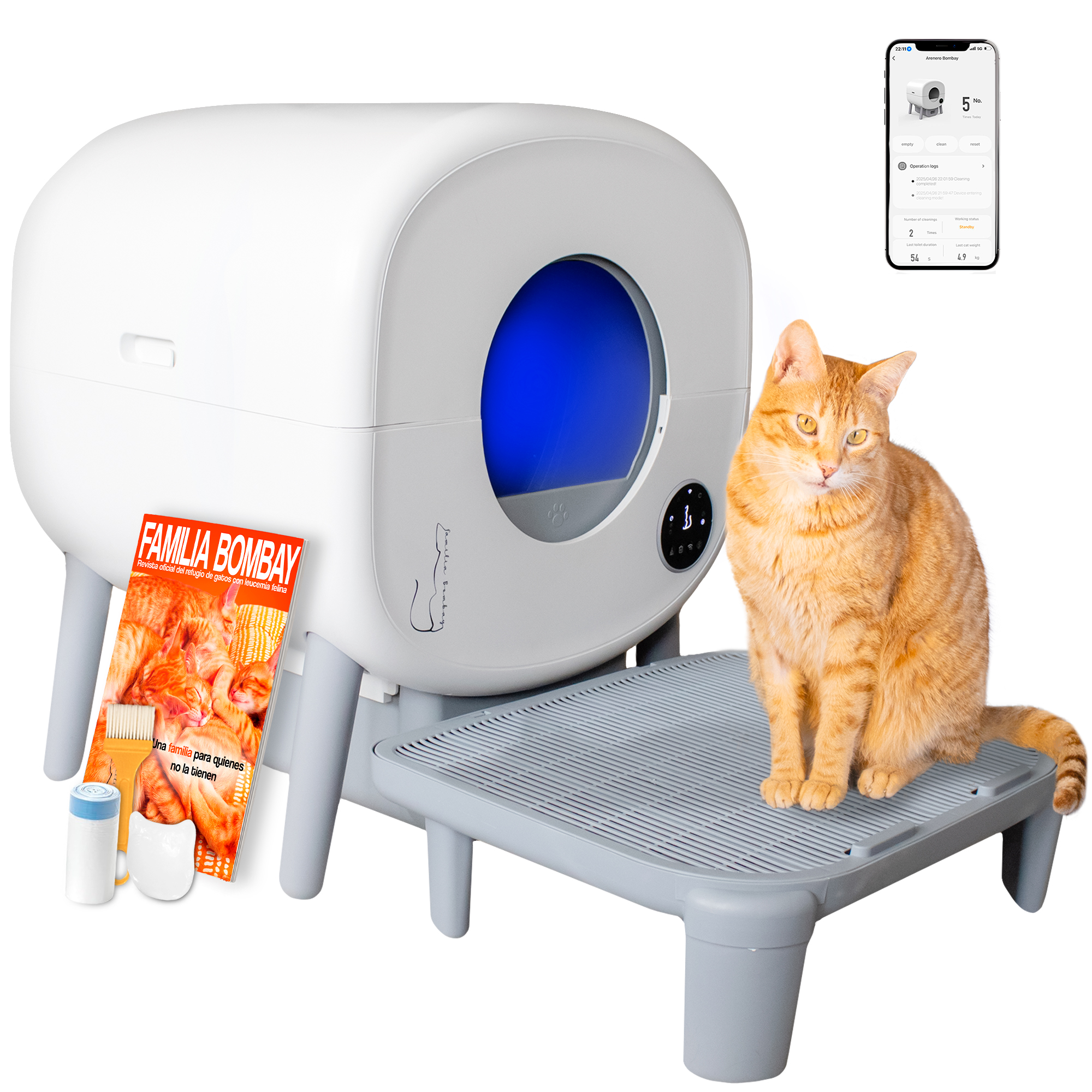 De montaje rápido y piezas lavables, incluye bolsa de residuos, ambientador, cepillo, taburete y revista. Además, el 30% de los beneficios se donan a Familia Bombay, en apoyo a gatos rescatados con leucemia.